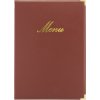 Klassisk Securit A4 menuomslag. Dette håndsyede menukort i klassisk læderstil med ordet "Menu" præget i guld er perfekt til traditionelle barer, pubber, restauranter og cafeer. Det klassiske menukort har guldfarvede metal hjørnebeskyttere og er designet til intensivt dagligt brug og de guldfarvede detaljer giver samtidig et flot og stilfuldt udtryk til din virksomhed.