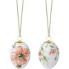 Sættet består af to håndmalede porcelænsæg, hvor dekorationerne bevæger sig hele vejen rundt om hvert æg. Det ene æg fremhæver tidslens kraftfulde blomsterform og grafiske blade, mens det andet præsenterer små blomster og fine stilke i et blødere og mere poetisk udtryk. Sammen skaber de en balanceret og stemningsfuld helhed.