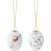Sættet består af to håndmalede porcelænsæg, hvor dekorationerne folder sig hele vejen rundt om hvert æg. Det ene æg fremhæver valmuens elegante kronblade i en mere markant dekoration, mens det andet viser små blomster og fine stilke i et luftigt og poetisk mønster. Sammen giver de variation, balance og dybde i påskepynten.