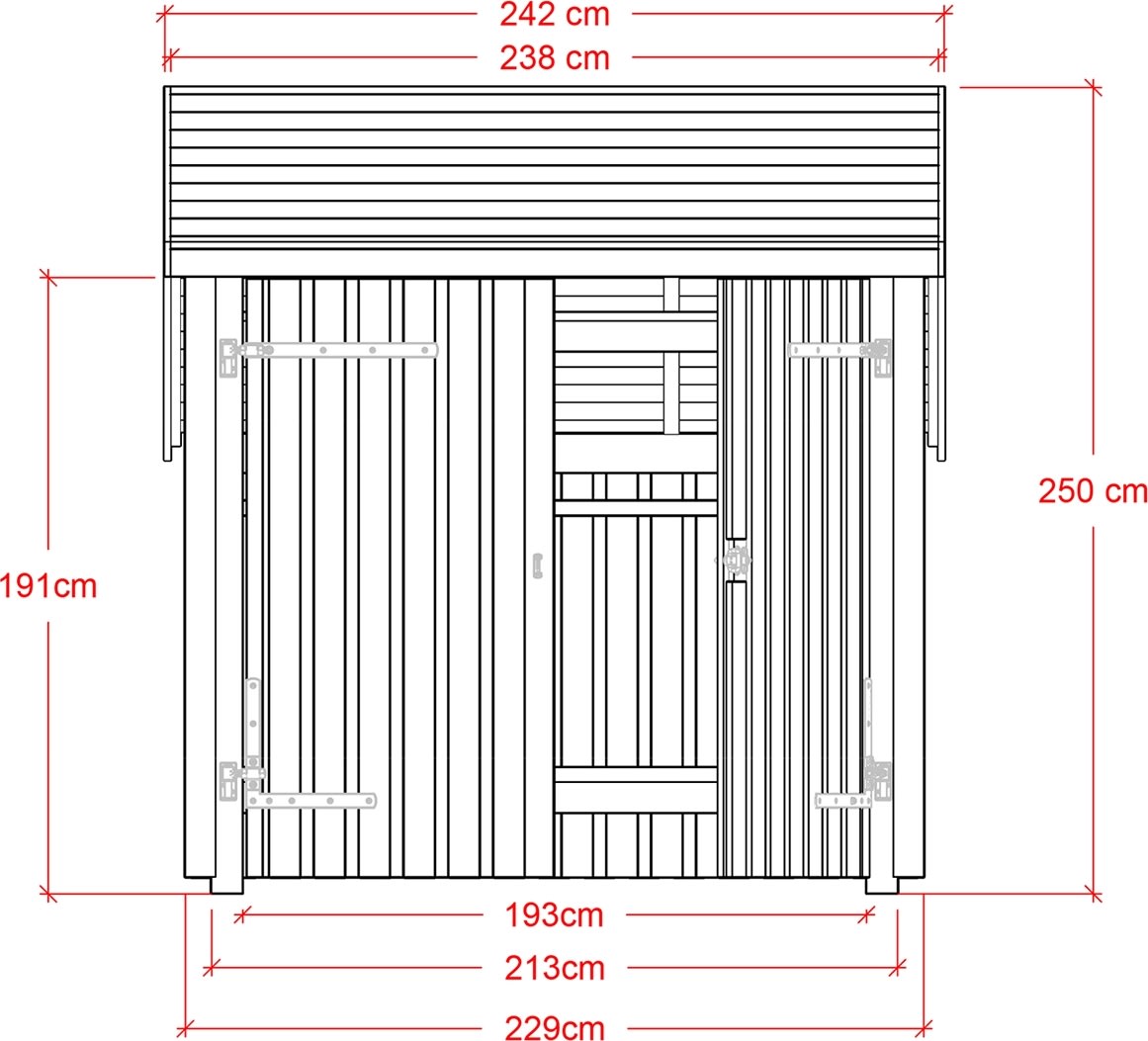 - Mål udvendig (LxBxH): 229 x 248 x 145/202/250 cm