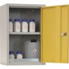 Kompakt kemivægskab med akrylvindue i døren, der giver visuelt overblik over indholdet uden at åbne skabet. Fremstillet i pulverlakeret stål og udstyret med opsamlingskar til håndtering af spild. Velegnet til arbejdspladser med behov for sikker og let tilgængelig opbevaring.