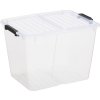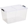 Den gennemsigtige plast gør det let at se indholdet, og boksen kan stables for at udnytte pladsen bedst muligt. Serien fås i flere størrelser, som kan kombineres.