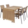 Havemøbelsættet er udført i vejrbestandige kvalitetsmaterialer, der kræver et minimum af vedligeholdelse. For at beskytte teaktræet og forlænge holdbarheden, anbefaler vi, at du behandler dem inden de tages i brug første gang. Hvor ofte du skal behandle produkterne afhænger af: vejr- og vind, slitage og daglig anvendelse af produkterne. Møbler med teak vil altid patinere over tid og få en næsten sølvgrå overflade.