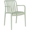 Denne moderne udendørs stol, kombinerer funktionalitet med stilrent design. Med sine behagelige og praktiske armlæn og komfortable rygstøtte er stolen perfekt til caféer, restauranter og udemiljøer. Den lette konstruktion i plast gør stolen nem at flytte, samtidig med at stolen er nem at opbevare og sparer plads da den kan stables. På undersiden af stolen, er der påsat silikonedupper, som beskytter stolene når de stables og samtidig sikrer at de stables stabilt.