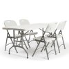 Sættet består af et klapbord der måler H74xB76xL183 cm, og 6 stk. klapstole som måler H87xB47xD57 cm., og har en sædehøjde på 47 cm. Sættet er nemt at rengøre og stor set vedligeholdelsesfrit. Den lave vægt på møblerne betyder at det er let at sætte op til forskellige arrangementer, og naturligvis ligeså let at pakke væk igen. Der kan tilkøbes transport- og opbevaringsvogn til både stole og borde.